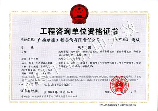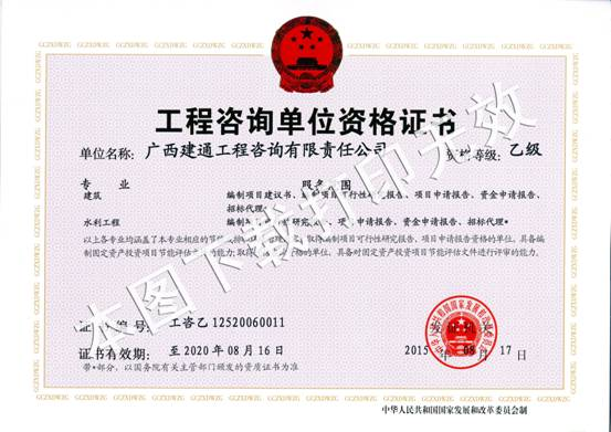 在集團公司的正確領(lǐng)導(dǎo)下,集團各部門同事的大力支持和協(xié)助下,品牌運營公司經(jīng)過多方努力,積極準備,按資質(zhì)等級標準要求向廣西工程咨詢協(xié)會、中國工程咨詢協(xié)會等管理部門遞交申報材料,我集團旗下子公司廣西建通工程咨詢有限責任公司于2015年9月14日《工程咨詢單位資格證書》成功由原來水利工程專業(yè)丙級升級到乙級,目前我們該項資質(zhì)所具備的專業(yè)有:1.建筑(乙級)、2.水利工程(乙級)、3.公路(丙級)、4.林業(yè)(丙級)、5.農(nóng)業(yè)(丙級)、6.生態(tài)建設(shè)和環(huán)境工程(丙級)、7.水文地質(zhì)(丙級)、8.城市規(guī)劃、9.市政交通(丙級)、10.市政給排水(丙級)、11. 市政風(fēng)景園林(丙級)、12. 市政環(huán)境衛(wèi)生(丙級);服務(wù)范圍包括:規(guī)劃咨詢、評估咨詢、編制項目建議書、編制項目可行性研究報告、項目申請報告、資金申請報告、招標代理*、工程監(jiān)理*(帶*部分,以國務(wù)院有關(guān)主管部門頒發(fā)的資質(zhì)證書為準)。