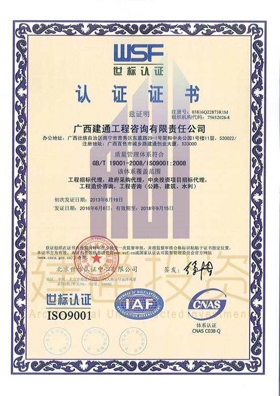 2013年6月,廣西建通工程咨詢有限責(zé)任公司率先引進了ISO9001國際質(zhì)量管理體系,三年以來,我公司秉承IOS國際質(zhì)量管理體系中“質(zhì)量管理精益求精、客戶滿意最終目標(biāo)”的核心理念,求實創(chuàng)新、努力創(chuàng)建完善的質(zhì)量管理體系,在公司管理經(jīng)營上實現(xiàn)了一次又一次的精彩超越。此次集團建通咨詢、建信設(shè)計、建通監(jiān)理三家子公司同時引進ISO9001、ISO14001、OHSAST18001管理體系,讓公司在原有的質(zhì)量管理體系的基礎(chǔ)上更進一步完善,更加國際化、科學(xué)化、合理化、成熟化、規(guī)范化,將“質(zhì)量管理、客戶服務(wù)由我做起”的良好意識植入每一位員工的心中,開創(chuàng)了建通集團質(zhì)量管理和服務(wù)意識的新篇章,更為廣大新老客戶提供了國際標(biāo)準(zhǔn)化的、更為專業(yè)的服務(wù)。ISO9001、ISO14001、OHSAST18001三大體系的成功引進,是對公司質(zhì)量體系管理、環(huán)境體系管理、員工職業(yè)健康安全管理工作的高度肯定,是對公司各項管理工作規(guī)范化、標(biāo)準(zhǔn)化的全面檢測,是對公司持續(xù)穩(wěn)定健康發(fā)展的重要保證。對不斷提高管理水平、員工環(huán)保意識以及提高公司市場競爭力有很大的促進作用,同時也充分表明建筑行業(yè)相關(guān)領(lǐng)域及社會各界對我集團信譽、服務(wù)、品質(zhì)等各個環(huán)節(jié)的高度認(rèn)可。同時也要求我們進一步找出不足的地方,將持續(xù)改進的工作原則一直貫徹下去,努力將公司的各項管理水平推到一個又一個新的高度。
