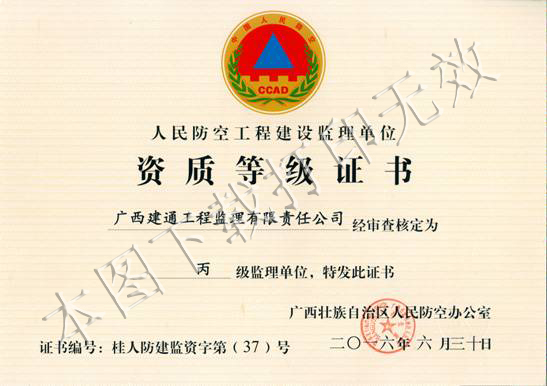 根據(jù)國家人防辦《人防工程監(jiān)理行政許可資質(zhì)管理辦法》以及《廣西壯族自治區(qū)人民防空行政審批操作規(guī)范》等有關(guān)規(guī)定,廣西建通工程監(jiān)理有限責(zé)任公司人防工程監(jiān)理丙級資質(zhì)證書在有效期屆滿后,及時向自治區(qū)人防主管部門提交資質(zhì)延續(xù)申請材料,并于2016年6月30日成功獲得新頒發(fā)的人防工程監(jiān)理丙級資質(zhì)證書。該資質(zhì)業(yè)務(wù)范圍為:本行政區(qū)域內(nèi)抗力等級6級、6B級及建筑面積1萬平方米以下的人防工程監(jiān)理業(yè)務(wù), 證書有效期至2017年8月30日。