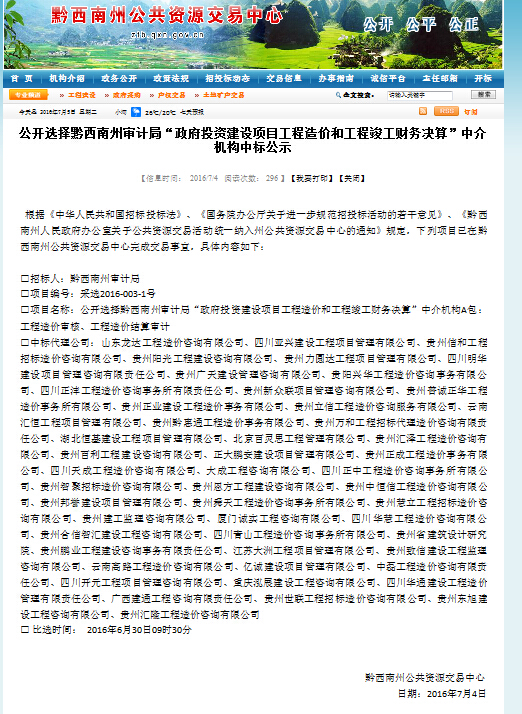 我貴州直營(yíng)分公司在繼“公開(kāi)選擇黔西南州水務(wù)局水利項(xiàng)目招標(biāo)備選招標(biāo)代理機(jī)構(gòu)”入庫(kù)成功后,又成功入選公開(kāi)選擇黔西南州審計(jì)局“政府投資建設(shè)項(xiàng)目工程造價(jià)和工程竣工財(cái)務(wù)決算”中介機(jī)構(gòu)A包:工程造價(jià)審核、工程造價(jià)結(jié)算審計(jì)。本次共有93家單位參與投標(biāo),我公司在激烈的競(jìng)爭(zhēng)中成功打敗43家單位,成為中標(biāo)的50家單位之一。