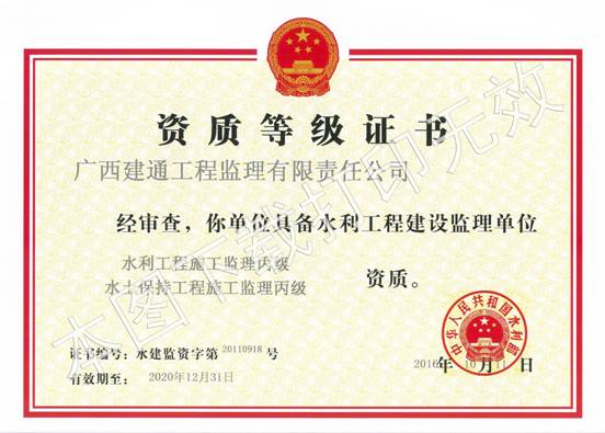 2016年10月14日,據(jù)中華人民共和國(guó)水利部網(wǎng)站發(fā)布的公告:廣西建通工程監(jiān)理有限責(zé)任公司成功辦理水利工程施工監(jiān)理丙級(jí)資質(zhì)延期。