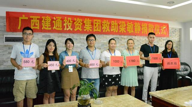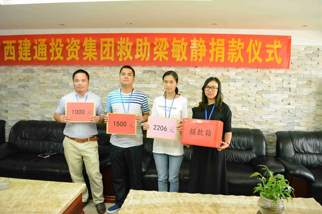 眾志成城,真情涌動。在集團董事長鄧安杰就梁敏靜身患重病作出“待崗就醫(yī)期間照常發(fā)放基本工資并增加生活津貼,仍享受集團的各項福利,集團第二秘書處全力協(xié)助配合梁敏靜家屬辦理醫(yī)療及住院手續(xù)”的指示后,集團員工發(fā)起了以“少喝一杯可樂,少抽一包香煙,少吃一個雪糕,延長一個生命,拯救一個家庭”為主要內容的《建通大愛·傳遞正能量》募捐活動,積極為梁敏靜捐款獻愛心,短短一天時間就募捐了45740元,其中百色總部24230元,南寧總部21510元。2016年9月,集團在得知梁敏靜的醫(yī)療總費用已高達245435.72元(其中醫(yī)療保險報銷部分為196527.32元,個人支付部分從集團45740元的捐款中撥付,已超支3168.4元)時,集團再次發(fā)出捐款倡議,也是短短數日,集團上下紛紛慷慨解囊,又籌集善款59594元,再次為梁敏靜解決了燃眉之急……