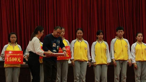 圖為集團(tuán)副總裁黃承理給受助學(xué)生頒發(fā)助學(xué)金