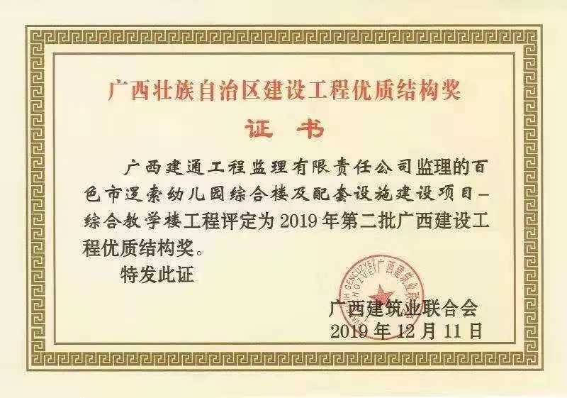 我集團子公司承接的《百色市邏索幼兒園綜合樓及配套設施建設項目-綜合教學樓》項目被授予2019年第二批廣西壯族自治區(qū)建設工程優(yōu)質結構獎稱號。