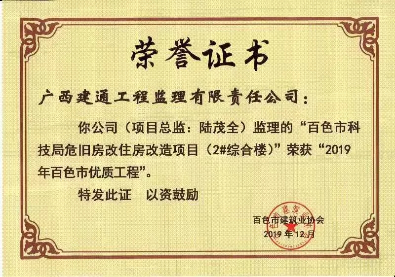 我集團子公司承接的《百色市科技局危舊房改住房改造項目(2#綜合樓)》項目榮獲了2019年百色市優(yōu)質工程稱號。