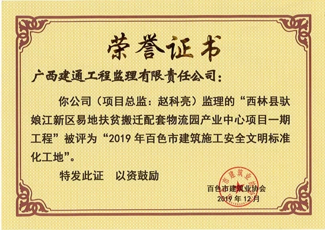 我集團子公司監(jiān)理的《西林縣馱娘江新區(qū)易地扶貧搬遷配套物流園產業(yè)中心項目一期工程》項目榮獲2019年(第四批)百色市建筑施工安全文明標準化工地稱號。