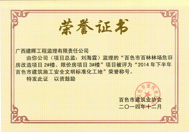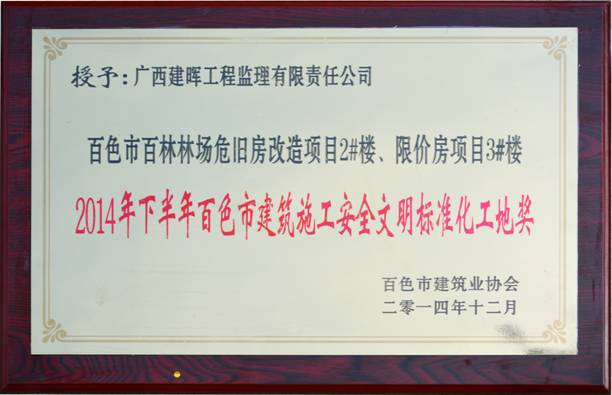 2014年12月,集團下屬子公司廣西建通工程監(jiān)理有限責(zé)任公司(原名廣西建暉工程監(jiān)理有限責(zé)任公司)監(jiān)理二所劉海霖監(jiān)理的“百色市百林林場危舊房改造項目2#樓、限價房項目3#樓”,在2014年下半年百色市住房和城鄉(xiāng)規(guī)劃委員會下屬機構(gòu)百色市建筑業(yè)協(xié)會組織的監(jiān)理項目評比中榮獲《2014年下半年百色市建筑施工安全文明標(biāo)準(zhǔn)化工地獎》。